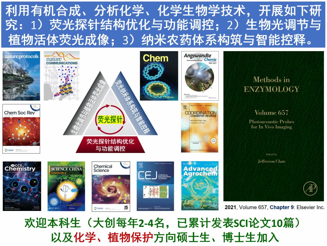 申请发明专利5项、授权4项;撰写英文专著2章;以通讯作者/第一作者身份在Chem, Nat. Protoc., Chem. Soc. Rev., Coord. Chem. Rev., Angew. Chem. Int. Ed., J. Am. Chem. Soc., CCS Chem., Sci. Chin. Chem., Chem. Sci.等期刊上发表论文一百七十余篇(其中ESI高被引论文13篇,热点论文2篇),他引10000余次,H指数52。指导的研究生有十多人获得国家奖学金。