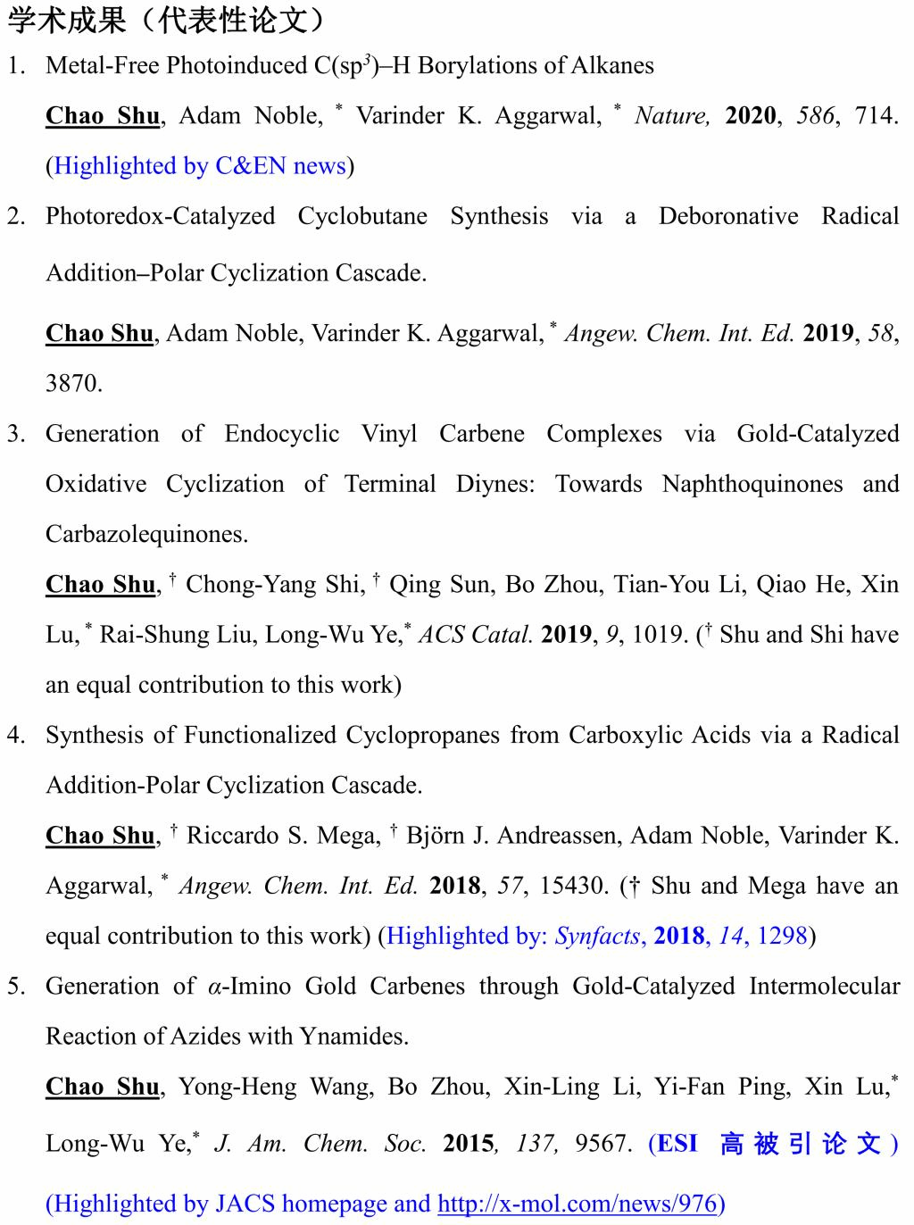 主要围绕有机功能分子及药物重要结构单元的设计与合成,药物中间体、生物抑制剂、天然产物的合成与应用等研究方向开展了较为特色的研究工作。目前,已在国际高质量期刊上发表学术论文30篇 (H-index 22),论文被引用2000余次,其中以第一作者发表SCI论文18篇包括国际顶级期刊Nature 一篇及J. Am. Chem. Soc. 一篇、Angew. Chem. Int. Ed. 二篇、ACS Catal. 一篇、Org. Lett. 五篇、Chem. Commun. 二篇等。申请人的研究工作中有ESI 高被引用论文 三 篇,二篇研究论文单篇被引>170次,研究成果受到国内外学者的认可和关注,多次被著名媒体和专业网址C&EN news、Synfacts、Organic Chemistry Portal、JACS Homepage和《有机化学》作为亮点评述,部分文章被选为front cover、frontispiece 和 hot paper。部分成果已被国内外多个课题组成功应用于天然产物的全合成研究中。