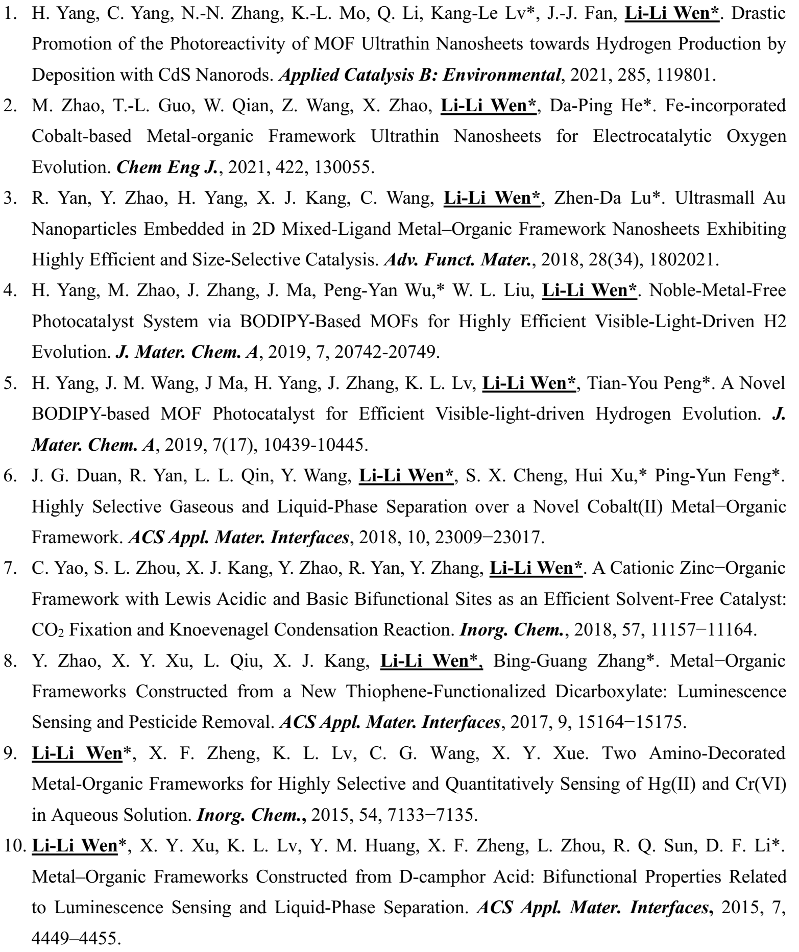1. 国家自然科学基金(21771072),用于可见光催化还原CO2的纳米尺寸锆基MOF的构建及其催化机理研究,2018.01 ~ 2021.12,主持人。