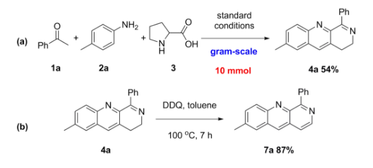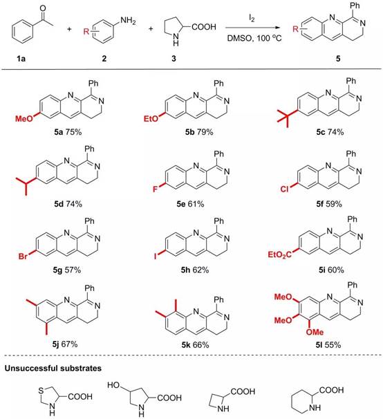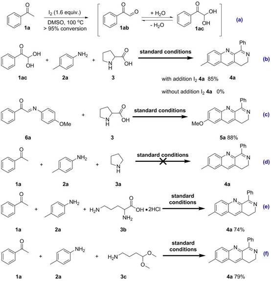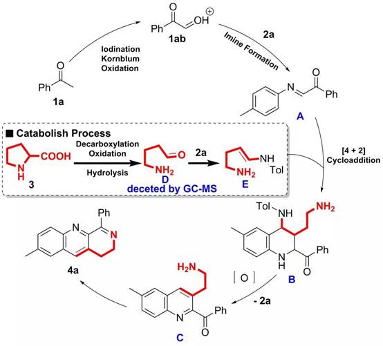 最后,作者基于控制实验以及之前报道的相关工作,提出了如下可能的机理(图六)。首先,苯乙酮经过碘代、Kornblum氧化生成酮醛中间体,然后与苯胺发生脱水缩合生成亚胺中间体A。与此同时,脯氨酸经过连续的脱羧、氧化、水解生成中间体D,然后与胺发生脱水缩并异构化生成中间体E。接下来,中间体E和A发生分子间的[4+2]环加成生成中间体B,随后经过氧化得到C,最后经过分子内的脱水缩合生成目标产物4a。