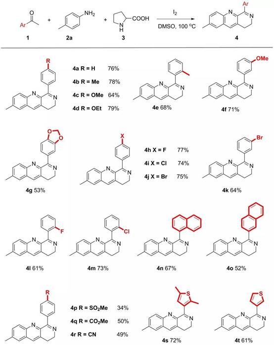 作者首先以苯乙酮、对甲苯胺、L-Proline和碘作为原料,于DMSO中进行反应,能够以72%的收率得到目标化合物。并在此之后进行了大量的条件筛选,最终在最优条件下能够以76%的收率得到目标化合物。得到了最优的反应条件之后,作者对底物进行了大量的拓展。芳基乙酮一侧对给电子基、卤素、萘环、吸电子基、杂环取代都能以中等至优的收率得到相应的目标产物,并且产物4a得到了晶体的证实(图二)。
