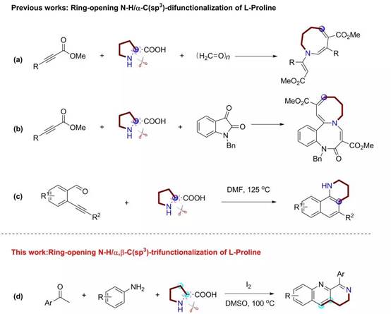 L-Proline是一类重要的天然产物, 与一般α-氨基酸不同,其没有自由的α-氨基,是一种α-亚氨基酸。其作为重要的有机小分子催化剂及多功能的合成片段,在有机合成领域得到广泛的应用。过去的一些报道主要是通过脱羧环化或脱羧偶联构建含吡咯的杂环化合物。除此之外,通过L-Proline的扩环策略化构建含氮杂环化合物也得到了报道。但是,这些工作主要实现其N/α-C的双官能团化。然而,通过L-Proline的开环实现其三官能团化却从未报道,仍是一个具有挑战性和有意义的课题。近日,我院吴安心教授课题组在该研究领域取得了新突破,相关研究成果发表于Org. Lett.(DOI: 10.1021/acs.orglett.9b01277)。