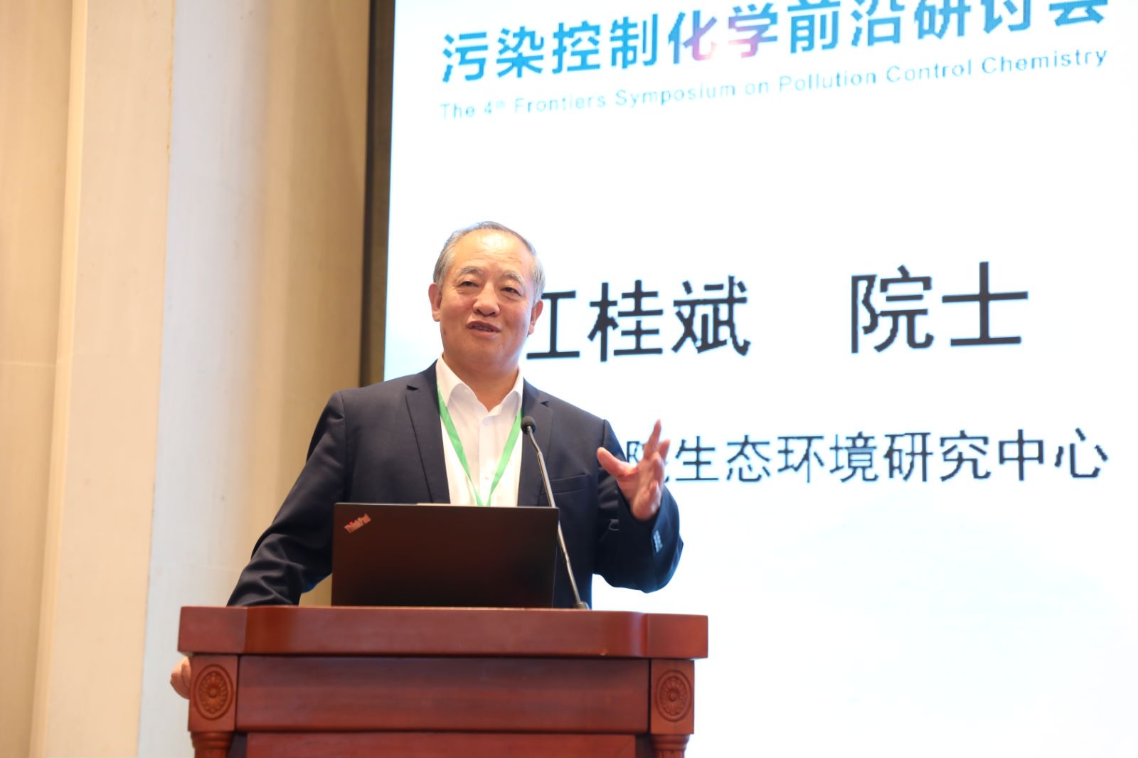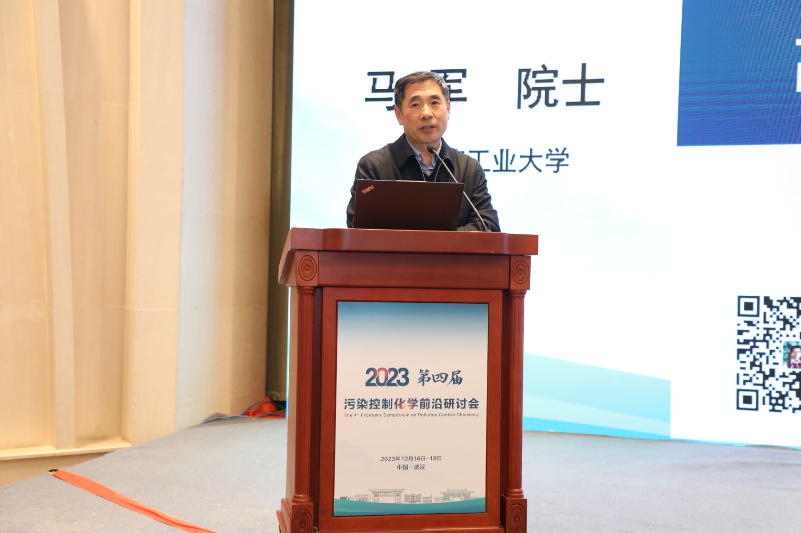 开幕式后,进入研讨会主旨报告阶段,一是朱利中院士主持,江桂斌院士作题为“环境化学一些热点问题”的报告,二是俞汉青院士主持,马军院士作题为“城市水系统面临的挑战及高铁酸盐在绿色低碳城市水系统中的应用”的报告。