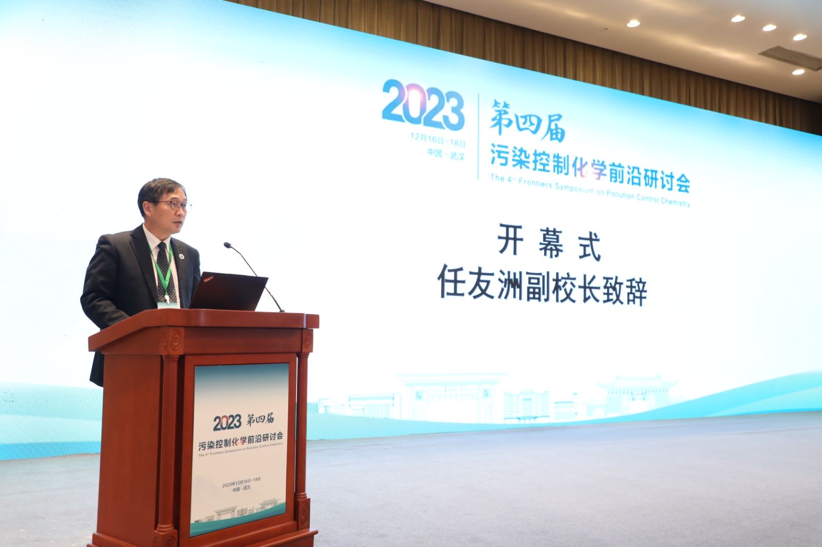 任友洲在致辞中介绍我校以及化学学院的历史沿革和发展情况,充分肯定化学学院在环境化学等领域研究中所取得的成绩,表示未来将紧紧围绕污染控制化学及相关技术创新开展研究,为传统产业节能减排和绿色经济发展贡献华师力量,并希望以此次会议为契机,推动污染控制化学前沿研究成果共享,加强密切合作,共创绿色低碳美好未来。