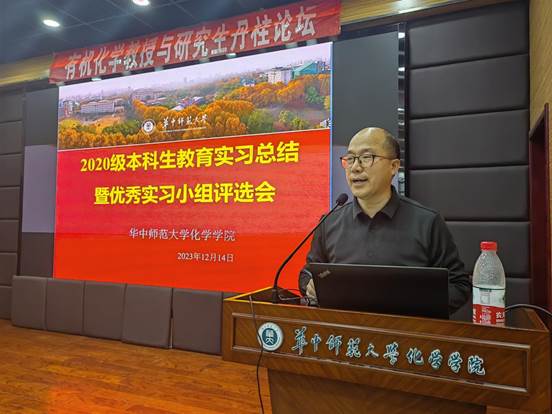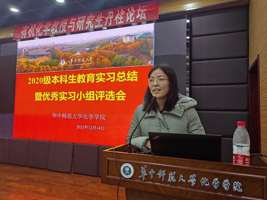 在会议的最后,化学学院教育实习负责人王世存进行了总结讲话。他指出,在今天的总结大会中,实习生们相互交流,在教学管理、科研等方面得到升华,他也希望实习生们能够在实习过程中进行反思。王世存还介绍了优秀实习小组和优秀实习生的评选规则,以及后续的工作。