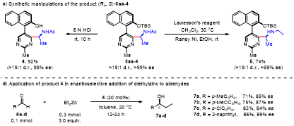 为了研究反应的实用性和产物的用途,作者进行了产物3aa-4的克量级实验以及衍生化实验,均获得了优良的收率,对映选择性也均能保持。随后为了探索这类轴手性骨架在不对称催化中的应用价值,作者将衍生化产物4作为轴手性有机小分子催化剂,并将其应用于二乙基锌对醛的不对称加成反应中,获得了优异的对映选择性(84-89% ee)(图3)。这些结果表明,该类新型的有机小分子催化剂在不对称催化中有望得到更广阔的应用。