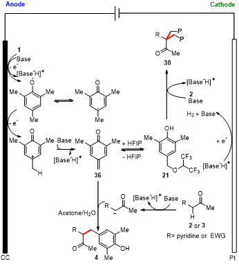 最后,作者对反应机理进行了深入的研究,首先在两种溶剂体系中进行循环伏安的测试,都表明均三甲酚的氧化电势小于吡啶酮,证明均三甲酚优先在阳极发生电氧化,从而生成对亚甲基苯醌中间体36。通过自由基捕获和自由基钟实验,排除了该反应经历自由基偶联的机理。当用HFIP作溶剂时,作者分离到HFIP与均三甲酚脱氢偶联的产物21,该中间体的生成相当于稳定了对亚甲基苯醌,对双烷基化的发生起到至关重要的作用。此外,结合核磁跟踪实验和控制实验,作者提出了该反应可能的反应机理(图4)。