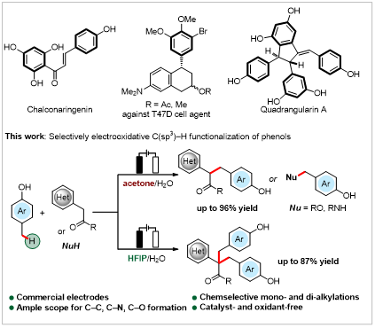 近日,华中师范大学徐浩教授课题组使用两种溶剂体系成功地实现了对甲基酚的单/双烷基化反应的选择性调控,该策略有以下特点:1) 改变溶剂体系实现反应化学选择性调控;2) 底物适用范围广,能够实现C-C, C-O, C-N氧化偶联;3) 能够实现全碳季碳中心的构建;4) 反应无需电解质和催化剂。