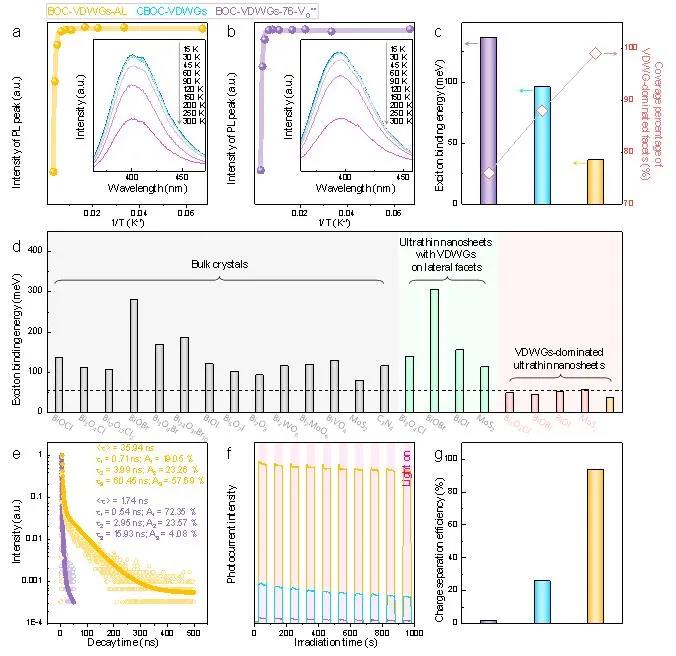 图4. 激子分离与体相电荷分离效率分析:(a) BOC-VDWGs-AL原子层和(b) BOC-VDWGs-76-VO••纳米片温度依赖稳态荧光发射光谱;(c) 范德华带隙暴露比例与激子结合能的线性依赖关系;(d) 常见层状材料的激子结合能;(e) 时间分辨瞬态荧光发射光谱;(f) 瞬态光电流响应密度;(g) 体相电荷分离效率。