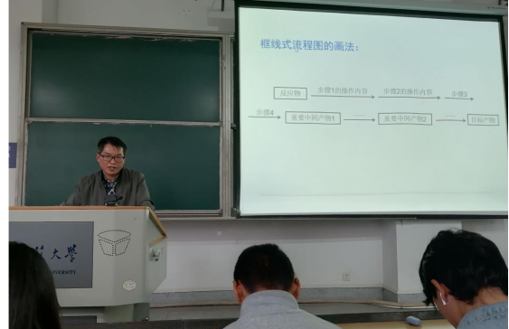 最后,宋发辉老师向同学们说明了实验的程序和操作,包括认真预习、做好实验并同时记录、写好实验报告三个环节。他介绍了实验报告的几种基本类型,以照片的形式作为示例,分别具体讲述了测定实验、制备实验和性质实验的实验报告格式,以及框线式流程图画法的统一要求,让同学们受益匪浅。