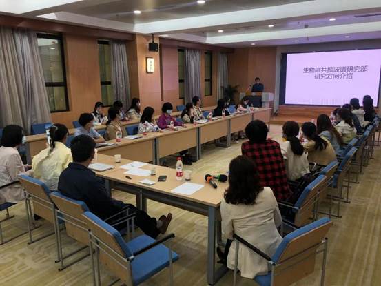 会议开始,师生共同观看精密测量院宣传视频,同学们初步认识和了解精密测量院的基本情况。紧接着,李从刚、徐君、陈世桢三位老师分别介绍了精密测量院的生物磁共振波谱研究部、固体磁共振波谱研究部、磁共振应用研究部的研究内容和方向。