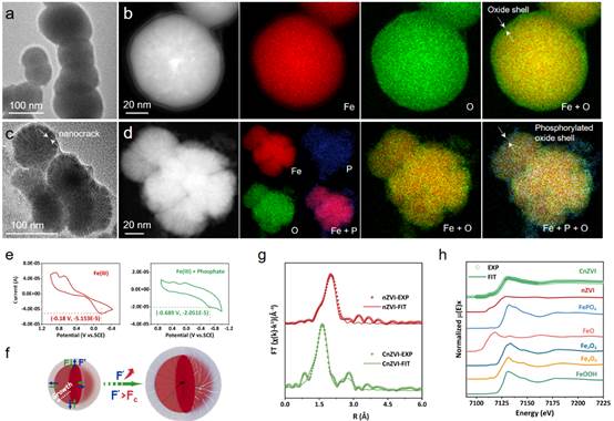 为了可视化重金属去除过程中的界面传质与电子置换作用,论文通过透射电镜监测单个铁纳米颗粒结构随时间变化过程。反应60 min,nZVI铁核内出现一个偏离中心的小空穴,随时间延长,空穴逐渐长大。反应240 min后,观察到一个中空环形结构,由未反应的Fe0和氧化层组成,剩余Fe0约占原始nZVI的50%。而CnZVI的空洞在反应30 min时就已出现,反应120 min可观察到完全空心化的CnZVI,并且有微小的Ni0纳米颗粒(7-8 nm)固定于CnZVI的氧化层中。