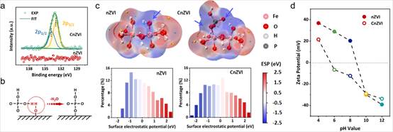 该工作通过简单的磷酸化方法制备了径向裂纹纳米零价铁,用于高效处理重金属废水。以Ni(II)去除为例,径向纳米裂纹作为界面电子/离子传输通道,有利于Ni(II)快速向内扩散,电子与铁离子向外转移,实现表面(Ni(II)/e-)与界面(Ni(II)/Fe0)的电子置换。同时,CnZVI可增加表面Ni(II)的浓度梯度,有利于Ni(II)向内扩散,并降低O2在表面竞争电子的影响。与nZVI主要将Ni(II)吸附于表面不同,CnZVI能够迅速还原并将Ni成功固定于氧化层中,去除容量高达(258 mg Ni/g Fe)。这种新型纳米零价铁对Cu(II)、Cr(VI)、Hg(II)等其他几种典型重金属离子也有很高的去除效率。在实际电镀废水处理中,CnZVI可实现Ni(II)与Cu(II)的同时去除,并达标排放。除了重金属去除,这种新型零价铁也极有可能具有放射性废物的富集与贵金属回收的前景。