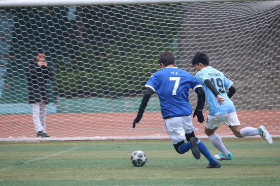 易边再战,物院男足削弱了防守端,加强了前场的攻势,试图在下半场的初期对我院男足形成有效压制,我院男足顶住防守端的巨大压力,重新掌握比赛的节奏,与物院踢起了拉锯战。第四十一分钟,物院10号边巴顿珠、7号叶力以及26号殷烁颖在禁区右侧打出精彩配合,通过短传推进步步逼近化院球门,我院后卫及时破坏,成功解围。比赛接近尾声,第五十七分钟,19号陈杏锋在边路单刀,连过两人后起脚挑射,物院门将又一次将球拦截,化院再失进球良机。随着时间流逝,常规时间结束,双方均未有建树,比赛进入紧张的点球大战环节。