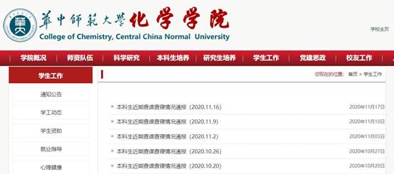 此外,本学期自10月20日起,各年级根据《化学学院查课查寝制度实施管理细则(暂行)》文件精神,每周开展形式多样的查课查寝活动,并对各年级学生寝室、课堂情况进行梳理、汇总,已累计形成5份《化学学院本科生近期查课查寝情况通报》。经《通报》显示,各年级寝室情况整体良好,少数寝室存在卫生问题,逐步跟进促使改进。