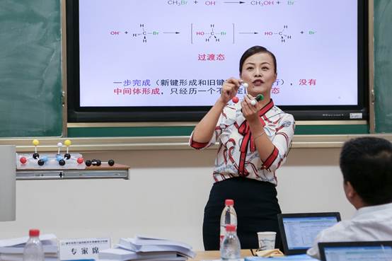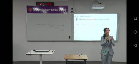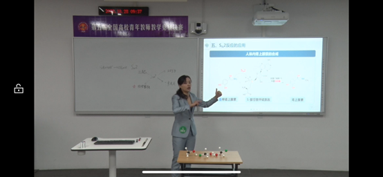 10月28日上午,佘能芳作为三号选手走上竞赛讲台。她从游泳运动员傅园慧“洪荒之力”的例子引入,回归“以本为本”的教学理念,以“双分子亲核取代反应”课程节段的基础知识为根本,紧密联系社会生活实际和学术前沿理念,于细节处渗透思政元素,实现了教学理念的升华,最终也得到了评委的一致认可。