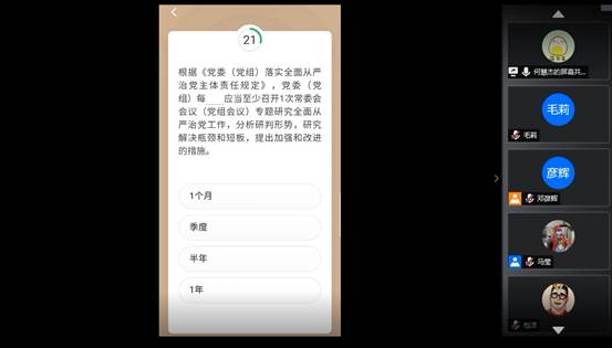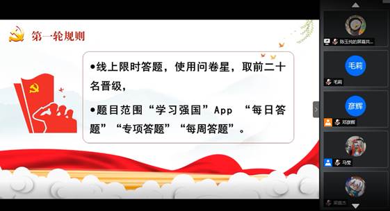 活动伊始,主持人介绍大致赛程。第一轮为线上问卷答题,题目来自于学习强国题库,分数前20名进入到第二轮;第二轮为学习强国“挑战答题”,选手需按照第一轮成绩倒序依次手机屏幕共享参与挑战答题,每人三次答题机会取最高分,分数前10名进入到第三轮;第三轮为选手抽取题目作答,根据第二轮成绩正序答题。本次知识竞赛共有80余名党员和入党积极分子自主报名参加。