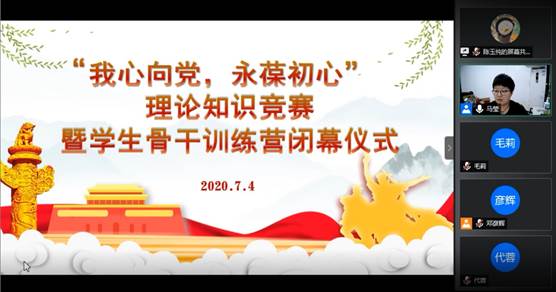 (通讯员 吴杨凯 付刘铮)7月4日晚,化学学院2020年学生骨干训练营知识竞赛暨闭幕式于线上顺利开展。此次活动旨在通过“学习强国”平台题库考察参与者的学习成果、强调学习党的理论知识的重要性并对此次骨干训练营进行闭幕总结。本次活动由中共华中师范大学化学学院委员会联合红石榴学习发展中心主办,化学学院2018级团总支学生会承办,物理化学研究所党支部、本科生红石榴党支部和本科生菁英党支部协办。