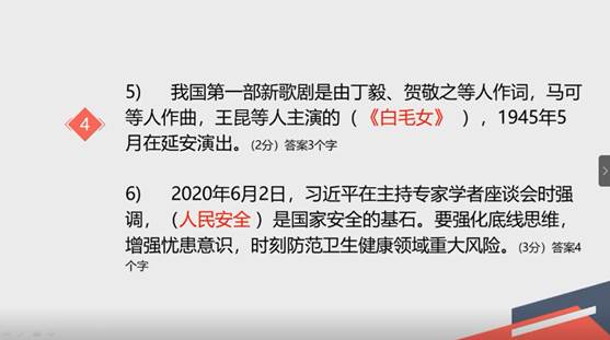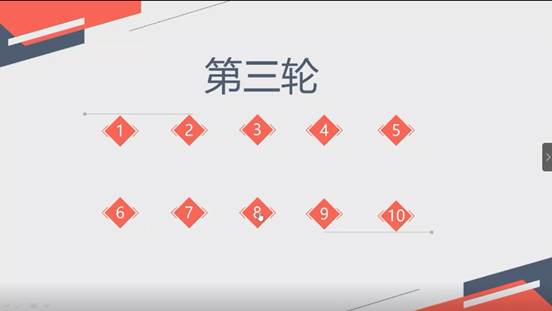 第三轮选取第二轮比赛前十名,考核形式为填空题,题目难度陡然上升,选手根据第二轮的成绩正序答题。PPT中有10套题目,每套题包含6小题,由选手抽取1套进行作答,回答完毕会记录获得的分数,根据分数高低决出一、二、三等奖。在第三轮的比拼中,题目包括“法律法规”、“会议精神”、“节日相关”等方面,来自18级的涂梦灵依靠强大的知识储备,取得了15分的佳绩,荣获一等奖。