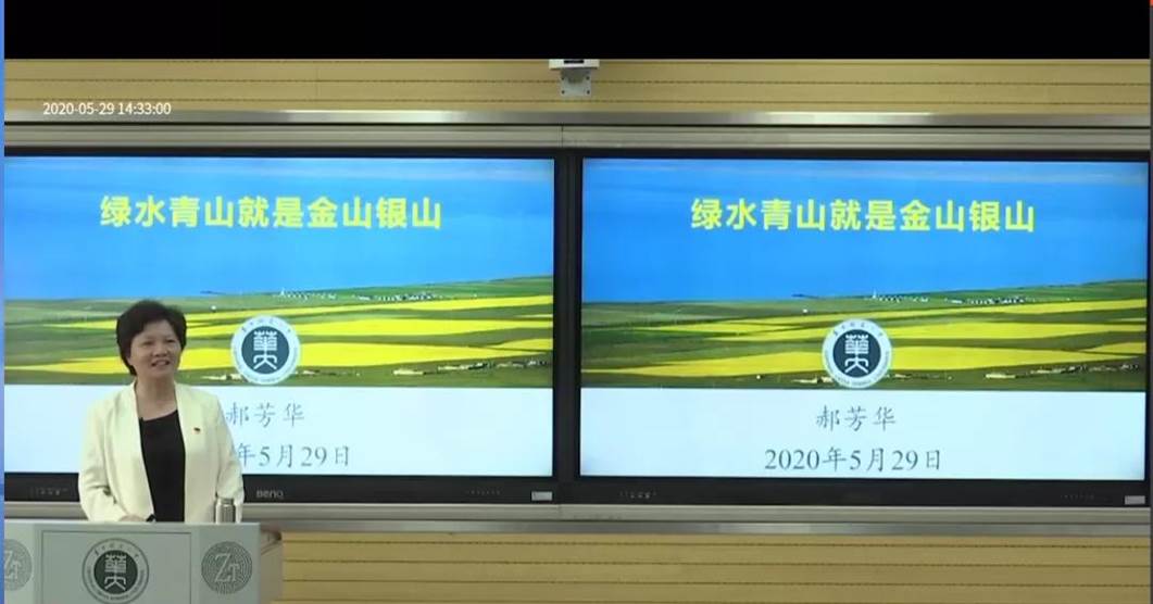 郝芳华校长讲授了四个方面的内容,一是我国的生态环境问题,二是习近平生态文明思想,三是绿水青山就是金山银山,四是推动形成绿色发展方式和生活方式。荒漠化、资源短缺、冰川融化,郝校长用具体数据和案例揭示我国生态问题的严重性,“生态兴则文明兴,生态衰则文明衰”。新时代生态文明的发展不能仅靠经济发展,需要将经济、社会和生态结合起来,共同健康发展,进一步领会习近平总书记所说的“绿水青山就是金山银山”的深刻内涵。最后,郝校长基于绿色发展的指导规划,提出可行的措施和建议,推动形成绿色发展方式和生活方式。生态环境保护是一个多方向的工程,生态环境保护不仅仅是国家和政府的事,我们每个人都应助力我国的可持续健康发展。
