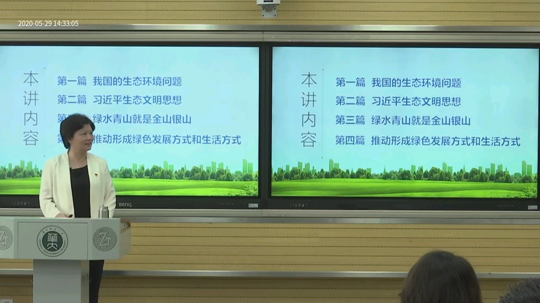 (通讯员 王思琪)5月29日下午14:30——16:30,“校领导讲思政课”系列活动在华中师范大学八号楼8414智慧教室成功举行,此次讲课主题是“绿水青山就是金山银山”。由华中师范大学校长、党委副书记郝芳华教授主讲,网络同步直播。化学学院各年级师生同步观看并展开热议。