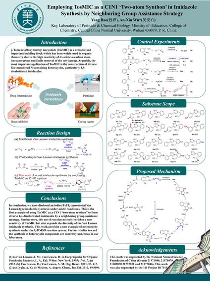 本次线上墙报展以“化学创造美好世界”为主题,共吸引了全国十六所高校本科生投稿,最终评选出一等奖2名,二等奖5名,三等奖9名,以及最佳人气奖1名,获奖学生主要来自清华大学、武汉大学、中山大学、四川大学、北京理工大学、华中师范大学、西北大学等高校。我院2017级化学(英才)专业本科生包洋在吴安心教授的指导下,将其业余科研成果用主题墙报的方式简洁生动的呈现给大家。经过各高校老师的专业细致的评审,其题为《Employing TosMIC as a C1N1 ‘Two-atom Synthon’ in Imidazle Synthesis by Neighboring Group Assistance Strategy》的主题墙报荣获二等奖。