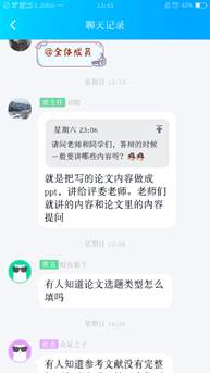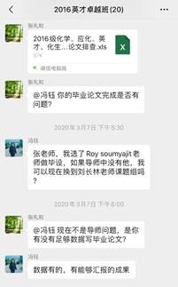 我院班主任还积极开展“毕业生五必谈”工作,通过面向全院本科毕业生开展“谈亲情、谈学业、谈就业、谈感情、谈交往”的谈心谈话活动,了解学生思想动态,有针对性地帮扶就业生,尤其是帮助他们解决学业和就业困难。在疫情情况下,我院作为实验学科,毕业论文的写作和答辩都有较大变化,针对此情况,我院班主任对学生都进行精准指导,帮助学生适应毕业答辩新形式。对毕业存在困难的学生,班主任们的指导则更为耐心和细致,以期帮助他们顺利毕业。1611班班主任张礼知和1612班班主任刘晓更是多次利用网络平台与班级学生开展集体、个人谈心谈话,帮助学生解决毕业设计、升学、就业等多方面问题。