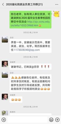 在学院的统筹部署和安排下,学院组建包括学院党委副书记、辅导员、班主任、专业教师在内的“2020届化院就业负责工作群”,联系用人单位、发布就业信息,班主任通过及时面向学生转发、及时反馈学生诉求等形式帮助学生了解就业信息、解决就业困难。