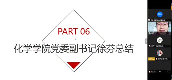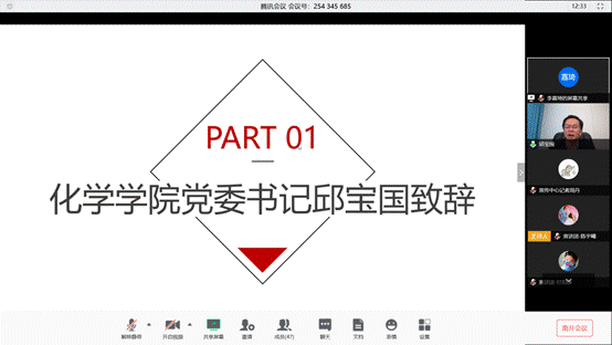 首先,化学学院党委书记邱宝国结合自身经历,给团员们传达了在全球抗“疫”的大背景下,当前中国抗“疫”取得阶段性成功,展示了中国之治的能力和优势和负责任大国的担当。邱书记寄语居家学习的同学们要用三个坚定打赢三场战役:坚定信心,打赢疫情防控阻击战;坚定信念,打赢网络舆论战,坚定责任,打赢线上学业战。同时他表示,党员、入党积极分子既要敢于发声,又要善于发声,共同凝聚抗击疫情的正能量。