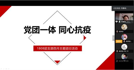 为保证团组织茁壮成长,并充分发挥党支部战斗堡垒作用,促进党建引领团建,1808团支部联合本科生红石榴党支部和本科生菁英党支部于4月6日开展“党团一体,同心抗疫”主题示范团日活动。活动采取线上会议形式,旨在通过党支部理论宣讲团成员多角度解读,使同学们进一步了解依法治国下的中国抗“疫”之旅。出席本次活动的嘉宾有校团委书记徐刚,化学学院党委书记邱宝国,化学学院党委副书记徐芬,化学学院团委书记马莹,全国党建样板支部组织委员兼1808班主任任彦亮,化学学院19级辅导员武双欣,化学学院理论宣讲团成员。活动由1808班团支书李嘉琦主持。