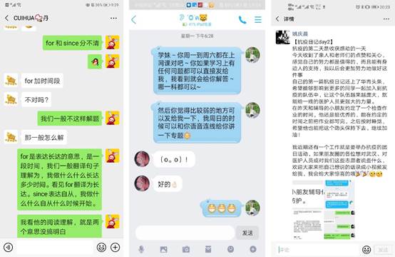 学生党员志愿者2017级姚庆晨对接的是一位七年级的学生,辅导学生各科功课和检查作业。由于学生比较腼腆,志愿者在辅导过程中有意识地鼓励学生主动提出问题,及时解决心中困惑。在辅导过程中,志愿者用朋友圈记录了自己的抗疫日记,希望通过自身的努力帮助到更多的人。入党积极分子、学生志愿者2017级张姚柠在对接一名备战中考的学生时,积极与学生的老师取得联系,摸清学生的大致情况。结合九年级学生的线上学习情况,志愿者常态化与学生进行交流的同时,及时调整辅导计划,采取“每晚+周末”结合的方式为学生提供有关专题的针对性讲解,希望学生能实现中考目标,努力过关。