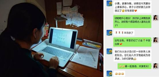 辅导结束后该学生的母亲也及时联系到惠馨赏,对她的志愿帮扶表示赞许。听到来自一线的医务人员的肯定,她的脑海里浮现出了四个字“并肩作战”。尽管她的线上志愿学业辅导与医护人员在死神手中抢人相比是那样的微不足道,但00后的她终能在青春的画卷中书写下“同舟共济”的有力话语。00后的学生志愿者,虽不能冲上前线奋勇杀敌,但也可以铸就坚强堡垒,成为战友坚强的后盾。
