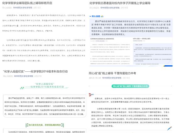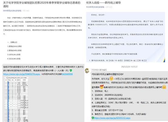 面向校内,我院红石榴学习发展中心学业辅导团队自线上开学第一周即面向学院各年级本科生开设9门专业课程的学业辅导,尽力帮扶在学业上存有困难的同学。面向校外,2016级本科生建立了“化学人战疫”QQ群,向全院学生发起倡议,积极招募线上志愿者为全国各地400余名中学生开展QQ群内防疫知识普及和学业辅导。同时,学院团委积极配合校团委组织40名学生志愿者参加华中师范大学青年志愿者与防疫一线医务人员子女结对计划,为武汉一线医护人员子女开展点对点帮扶。在学院教师的主动联系下,我院特别召集志愿者对接江浙支援湖北的医护人员子女,为他们做好远程指导,守候战“疫”的后方。非常时期,我院青年志愿者协会主动跟进志愿服务基地张家铺学校,第一时间组建志愿者团队,对点帮扶张家铺学校初中部的初三学子,为即将参与中考的孩子们保驾护航。