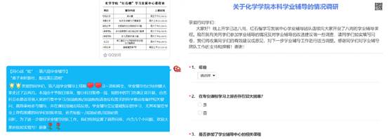 近日,学业辅导团队还专门面向各年级本科生设计了一则《关于关于化学学院本科学业辅导的情况调研》的问卷,收集同学们参加学业辅导的情况及对学业辅导的改进建议,后期将根据同学们的有效建议对学业辅导工作进行适当调整,提升学业辅导的实效性。
