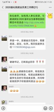 2月23日起,学院实时将学生就业信息发布给各毕业班班主任,实现共享共助;学院组建包括学院党委副书记、辅导员、班主任、专业教师在内的“2020届化院就业负责工作群”,动员校友和合作单位积极争取就业岗位,共享发布就业信息,加强全员就业指导力度;于3月3日下午召开“家-校-生”代表线上座谈会,全面收集对毕业就业方面问题和建议;学院组建“就业奖励方案起草群”,细商制度以尽可能积极鼓励校友、教师参与就业扶持工作中。