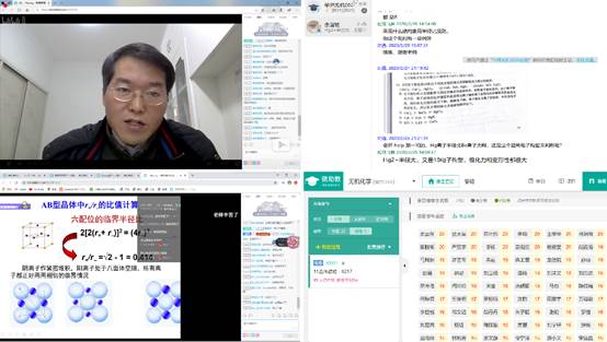 《无机化学》课程教师刘长林经过网上开学前的充足准备,从第一周开始面向我院化学生物交叉班的同学们上无机化学课。刘老师运用“腾讯会议+微信+云课堂”线上平台协同教学,按照“复习要点→提出问题→启发引导→提示讨论→关键解释→理解掌握→系统总结→完成作业→深度阅读→广度拓宽”的主线进行授课。同时,刘老师鼓励同学们多了解与生活有关的无机化学,在网络谣言中保持判断力,在大灾大难面前保持理性。