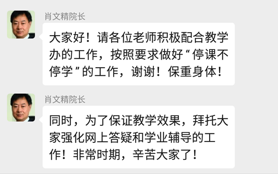我院积极响应校本科生院《2020年春季学期本科生延期开学返校及教学工作的安排》等相关通知,本科教学委员会主任原弘前期在教工微信群以及QQ群内提前安排、提前部署本科生教学工作,同时还提供了大量可供使用的教学资源,各课程组老师均进行了大量的准备工作来保障网上教学的平稳进行。肖文精院长也高度重视,强调要做好“停课不停学”工作,保证教学效果,强化网上答疑和学业辅导。