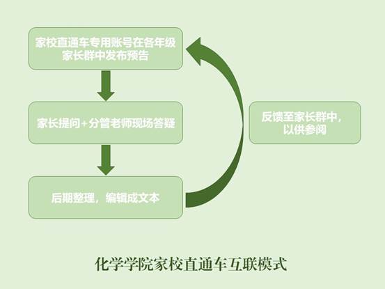 (通讯员 刘鹏)化学学院一直以来高度重视搭建家校沟通桥梁,创设家校沟通平台,特在红石榴学习发展中心中,建设“石榴千万里”版块,为促进家校沟通,打造家校命运共同体不懈努力。我院在2019年面向2015级至2019级全体本科生多次开展家校直通车活动,院党委副书记徐芬、各年级专兼职辅导员均参与到家校直通车活动中。活动开展过程中,除党委副书记、对应年级专兼职辅导员全程参与外,还委派专人发布活动预告、把控节奏、整理记录。