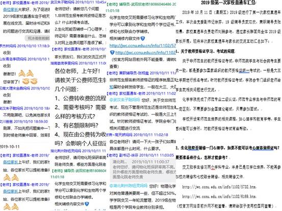 我院在2019年一共开展了9次家校直通车工作,累计共有2700人次家长参与家校直通车活动。针对不同年级学生特点,家长围绕学生在校适应情况、职业规划、政策解读、学业压力、生活状态、就业形式等方面问题与学院领导和辅导员在线上实时开展交流和沟通。每次线上交流结束后,还会专门将每次家长提出的问题进行汇总,并由辅导员老师和学院相关负责人进行完善后,上传在群文件中进行分享,方便学生家长查看和了解。我院家校工作贯穿育人全过程,各老师定期在各年级家校群中转发关于学校学院的一些新闻和政策,推动家校联系常态化,方便家长了解学校、学院的各项政策和学生活动开展情况。
