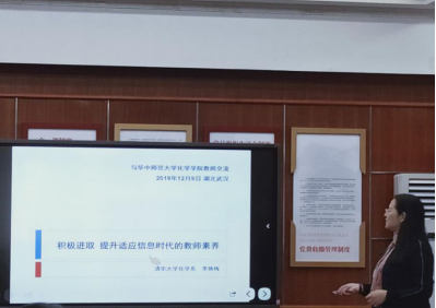 (通讯员 朱霞 冯玲玲)12月9日上午,在逸夫化学楼H502,教育部高等学校教学指导委员会大学化学课程教学指导委员会副主任委员、国家级教学名师、清华大学李艳梅教授应邀来到华中师范大学化学学院,为我院教师做了题为“积极进取,提升适应信息时代的教师素养”的教育专题讲座。本次讲座由教学委员会主任原弘教授主持,我院多位教师参加学习。