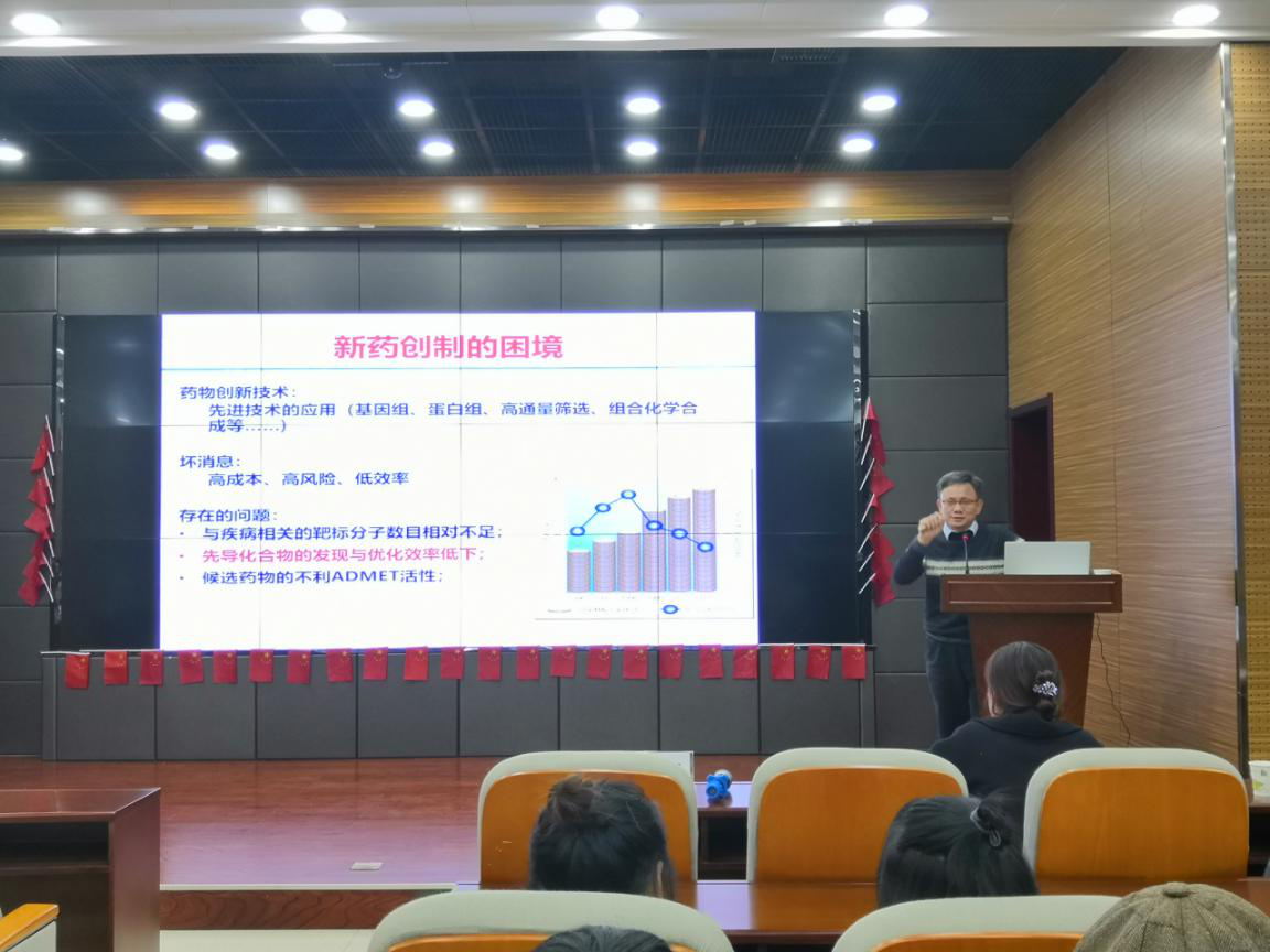 讲座一开始,罗教授就指出了在当下社会农药方面需要更多人才的现状。随后,罗教授提到了新药创制的困境:高成本,高风险,低效率等。他指出了药物的副作用(如脱靶效应)带来的瓶颈,以及先导物发现的效率低下对学科的发展的制约。