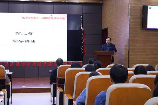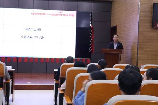 随后杨军部长也发表了讲话。作为化学学院的老领导,杨部长表示无论是研工部还是化学学院对研会举办学术年会都非常地支持。他强调,全体研究生应借助学术年会这股东风,相互切磋,增加交流,不断提升自己的科研能力,并预祝学术年会圆满成功。