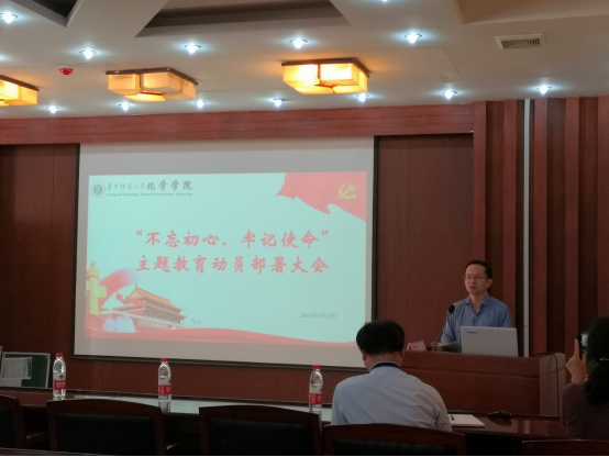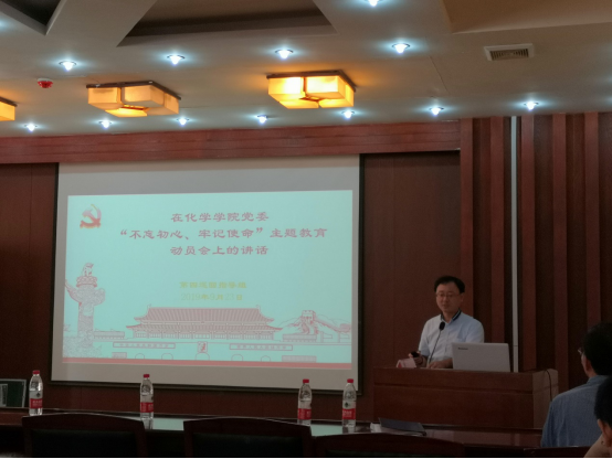 接下来,林更茂书记在动员会上讲话,对化学学院党委“不忘初心,牢记使命”主题教育提了五点要求:一、聚焦主题主线,深入学习贯彻习近平新时代中国特色社会主义思想,引领全体党员师生,特别是领导干部,原汁原味学、深入系统学、结合实际学,努力做到学懂弄通做实。二、把握12字总要求,努力实现5句话目标,全面把握守初心、担使命、找差距、抓落实的总要求,做到理论学习有收获,思想政治受洗礼,干事创业敢担当,为民服务解难题,清正廉洁做表率。三、统筹推进学习教育、调查研究、检视问题、整改落实、成效评估四项重点措施,落实领学、领悟、领研、领改、领督五项举措。四、严格履行主题责任,坚决克服形式主义、官僚主义。五、学校巡回指导组切实履行巡回指导职责,确保主题教育收到实效。