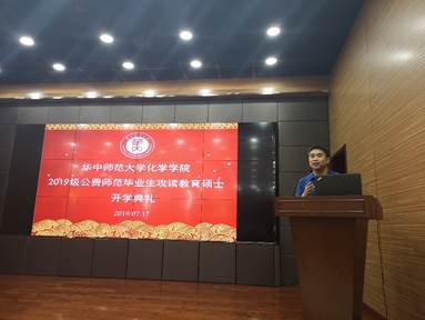 (通讯员:蒋翎旖)2019年7月17日,华中师范大学化学学院2019级公费师范生在职攻读教育硕士开学典礼在化学楼823会议室隆重举行。出席本次活动的领导嘉宾有华中师范大学化学学院党委书记邱宝国、党委副书记陈德均、副院长刘盛华、研究生教学秘书李学慧、辅导员梁晋华。本次典礼由陈德均主持。