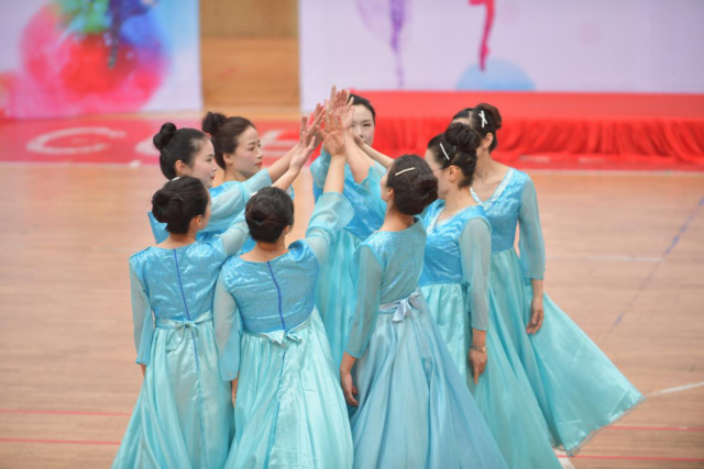 随后进行了全校排舞比赛,由16名女教工组成的化学学院教工代表队作为31个参赛单位之一登台展演。她们穿着那一抹端庄优雅的浅蓝色,脸上笑容洋溢着风韵,她们化身舞动翅膀的守护天使,以翩翩舞姿传播爱的芬芳与温暖,完美的演绎了具有化学魅力的《天使的翅膀》,最终老师们以饱满的姿态赢得了“最佳创意奖”的殊荣。学院党委书记邱宝国、学院教师们也纷纷到现场为我院教工的精彩表演鼓掌喝彩。