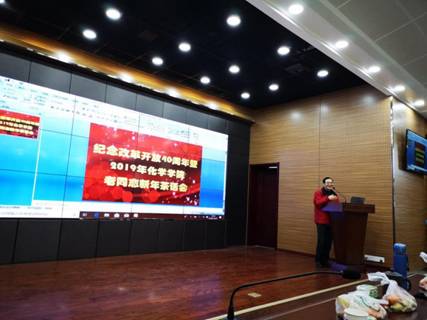 通讯员(王思媛 刘晓梅 )2018年12月27日上午十点,纪念改革开放四十周年暨2019年化学学院老同志新年茶话会在学院八楼报告厅顺利举行。活动由老年协会会长胡宗球主持,共有46位老同志参加。化学学院院长肖文精、党委书记杨军、副院长刘盛华,党委副书记徐芬、院长助理原弘等出席了本次活动。