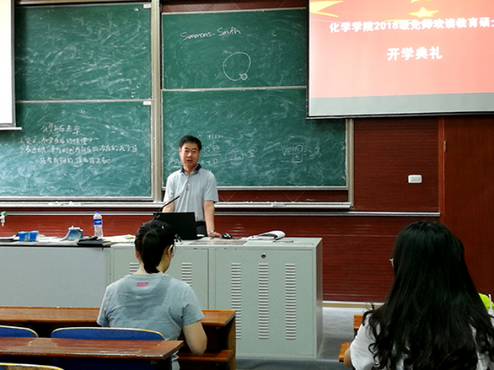 首先,化学学院院长肖文精教授致辞。他对2018级返校攻读教育硕士的同学们表示热烈的欢迎和衷心的祝贺,并指出,要让理论与实验碰撞,作为公费师范生,更要加强对教育教学的研究,获得教育研究成果,将教育研究运用到基础教育的实践中。希望同学们加强阅读,增强阅读储备,在阅读的过程中,不仅要读,还要写,要勤于思考和总结。在学术交流方面,要与师为友,多向导师请教;在课后与同学多交流;并且要有开放的意识,作为公费师范生,也要关心化学学科在国际上的前沿动态,把握学科走向,与时俱进。在致辞的最后,肖院长祝愿同学们在未来的时间里,身体健康,学习愉快,用青春与汗水,谱写新的篇章。