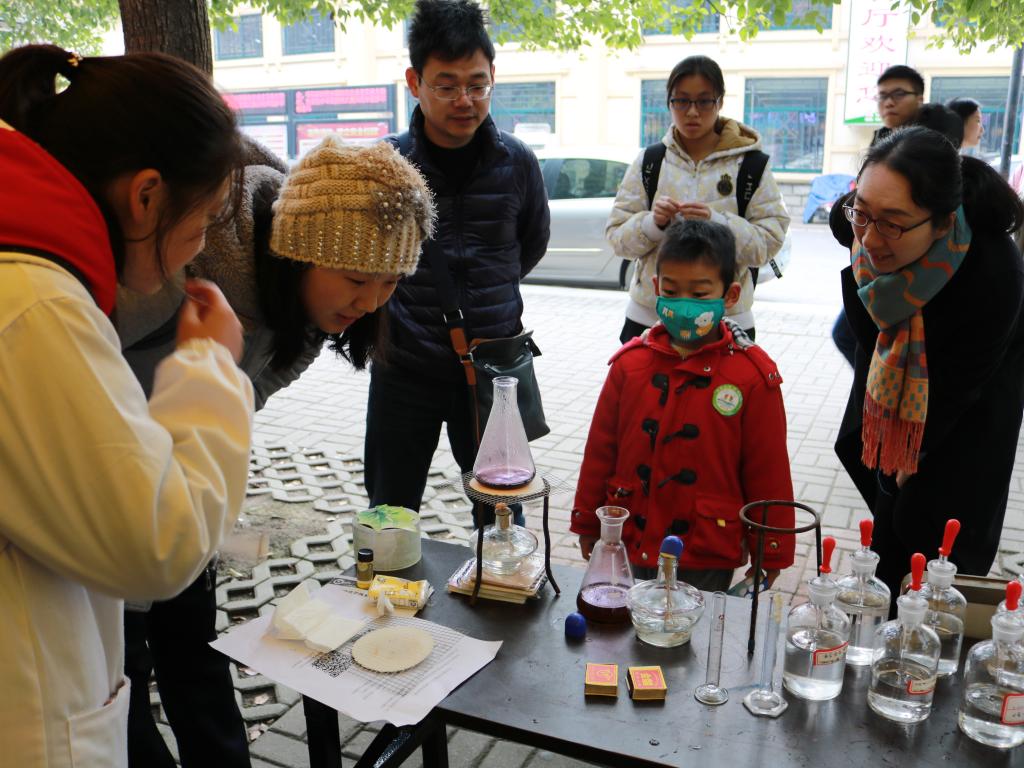 与此同时,实验场地中的化学实验也纷纷进行。在“试管中的彩虹”实验中,试管中溶液奇妙的变色现象引起了路人的阵阵惊叹;被称为“美到窒息的化学实验”——“黄金雨”实验以其闪亮的溶液效果让参与人员直呼化学的奇妙。化学的神奇魅力通过多种实验得以直观的展现。