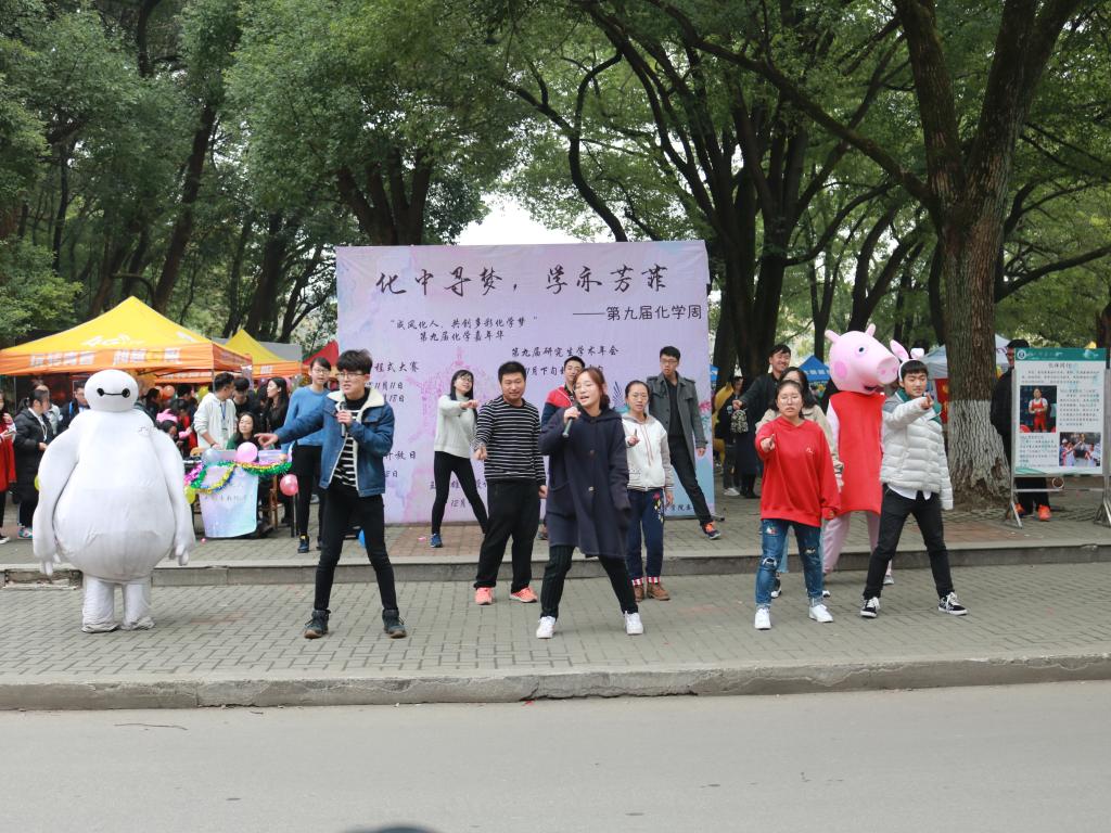 午后,化学嘉年华的重要活动“快闪”在场地入口如期进行。激情四射的舞蹈、动人的歌声将活动气氛推向高潮。卡通玩偶们也参与其中一同歌舞,各类节目相继登场,更是带动了同学们参与的热情,整个东区小树林热闹非凡。