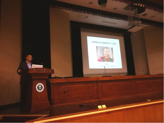 吴安心教授首先提到了在科学研究中应该保持良好的心态,他用流行的网络事件与图片结合的方式,教导同学们:“态度决定一切,我们不仅要具有知识,知道怎么样解决问题,还要发挥主观能动性,积极去解决问题。”他还希望同学们能够秉持“只有做不成事的人,没有做不成的事”的格言,在科学研究中面对困难时,能够迎难而上,积极面对问题,寻求解决办法。